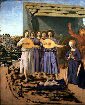 Ohne Musik kein Weihnachten! Das wusste auch Piero della Francesca, ein Maler der Frührenaissance des 15.Jahrhunderts in der Toskana. In seiner „Geburt Christi“ (hier ein Ausschnitt davon) sehen wir im