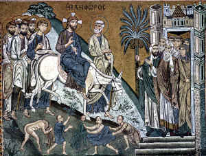 Einzug Jesu in Jerusalem. Kein Triumphzug, trotz der Hosianna-Rufe! Bald wird man anderes schreien: "Kreuzige ihn!" Jesus reitet nicht auf dem Schlachtross der Krieger und Sieger, sondern auf einer