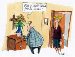Das Christentum hält sich verschämt zurück. Eine Karikatur: Eine Familie erwartet seltene Gäste. Im Flur hängt ein Kreuz. Der Hausherr stellt eine große Blume davor. „Muss ja nicht gleich jeder sehen…“