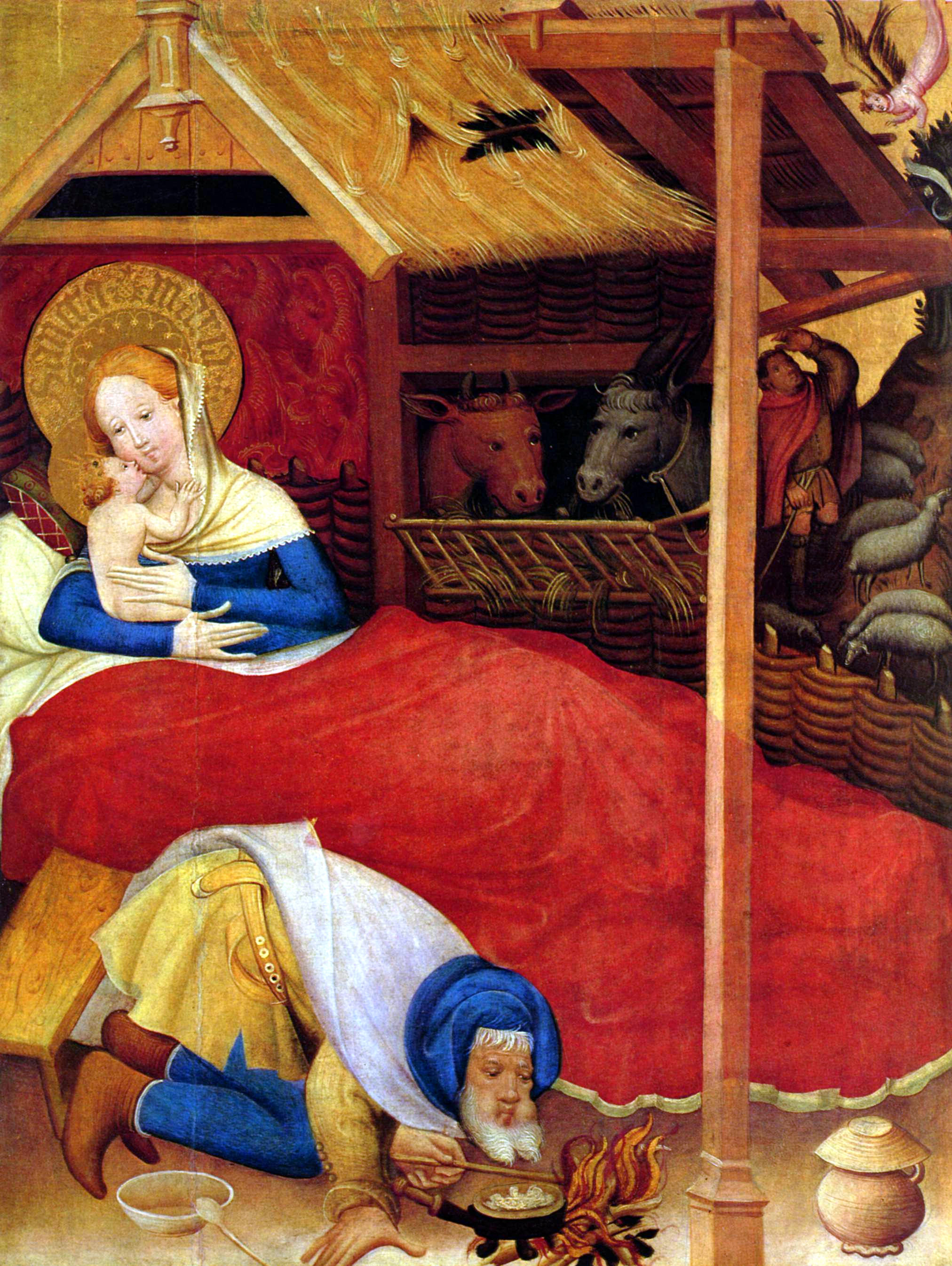 Vieles kommt uns vertraut vor: der Stall. Ochs und Esel wie auf einem Logenplatz. Ein aufschauender Hirte mit seinen Schafen. Ein Engel fliegt ins Bild und verkündet eine große Freude. Und dann Maria! Sie nimmt den größten Teil des Bildes ein mit